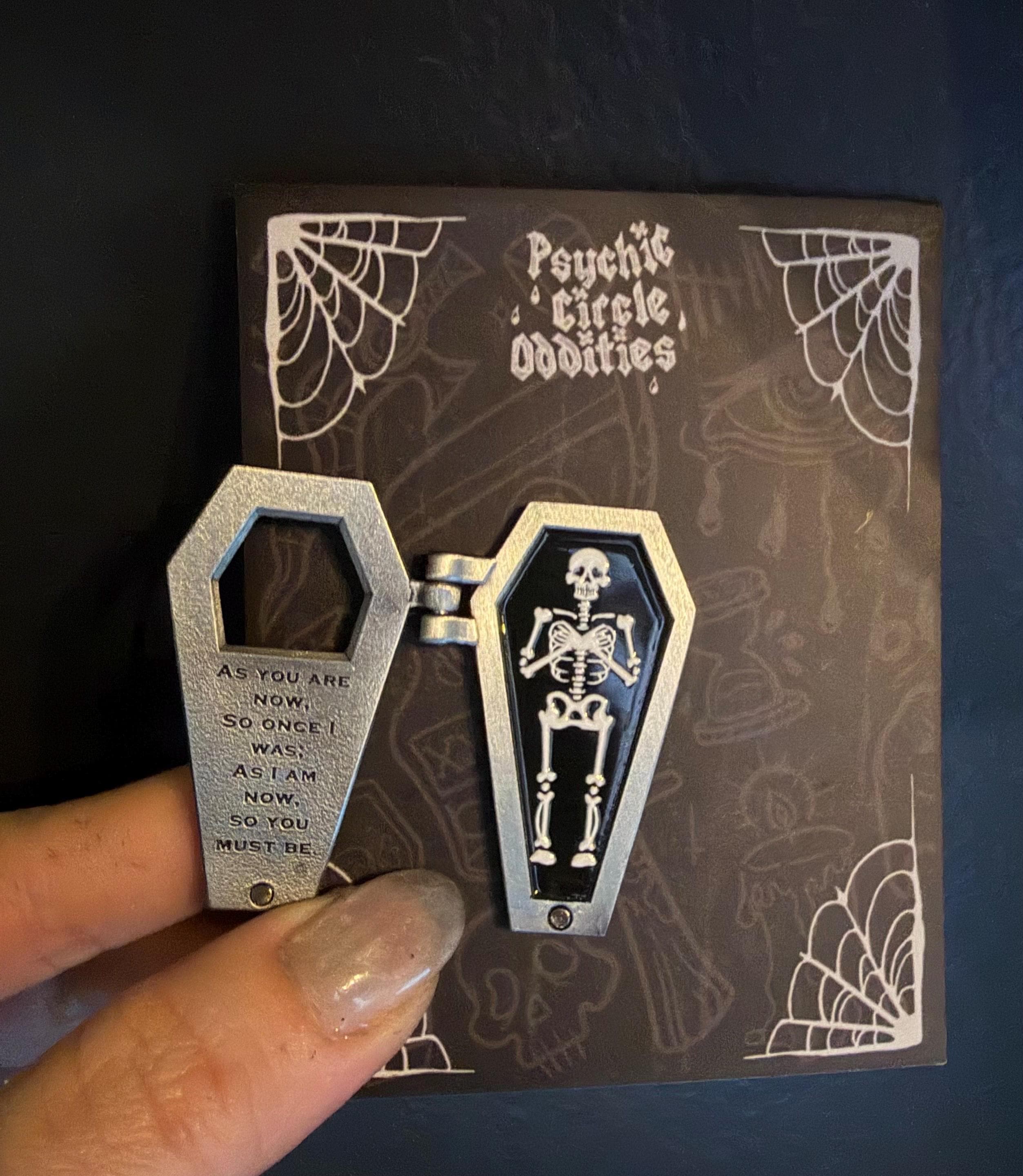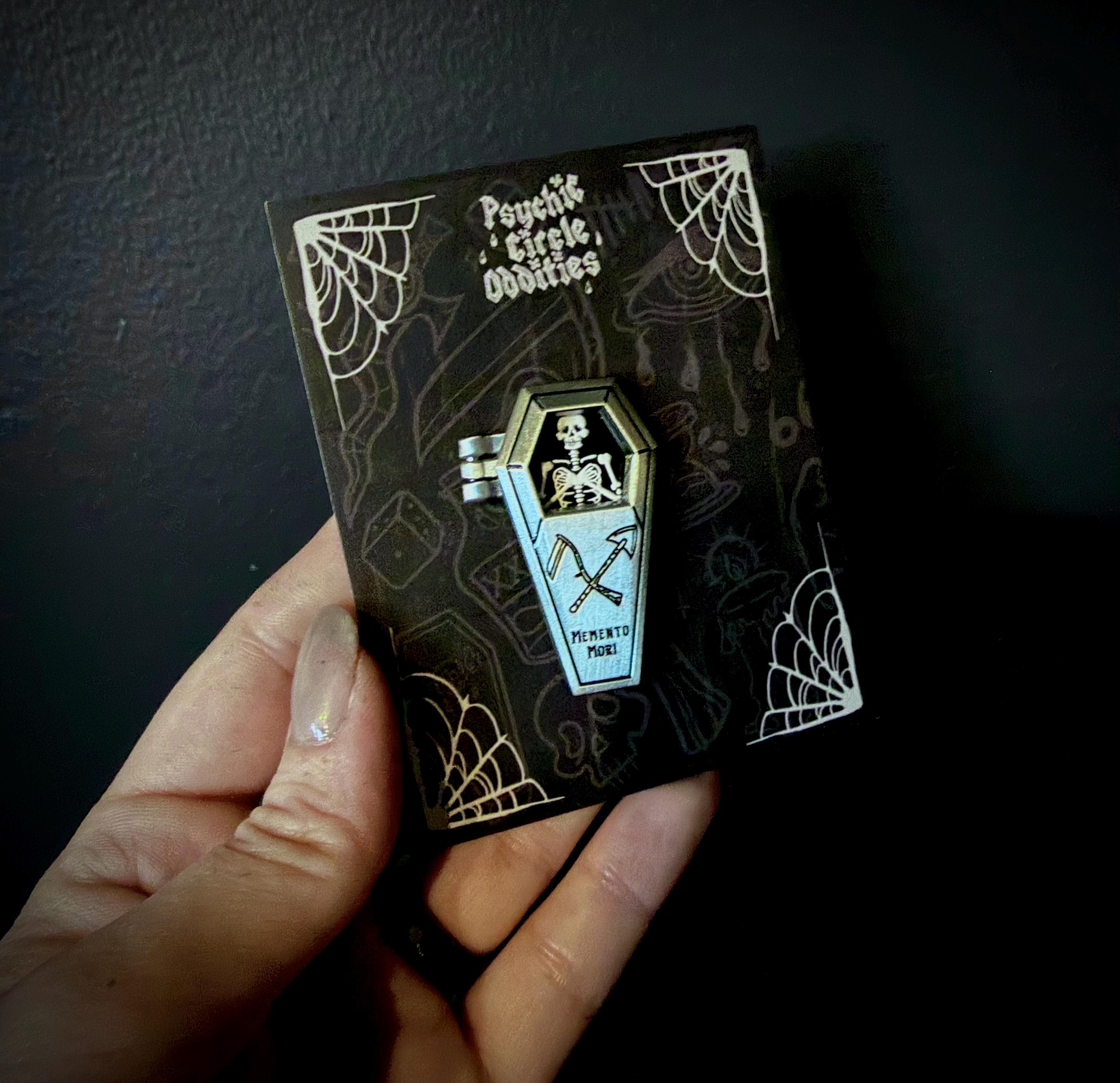 memento mori enamel pin, coffin pin, gothic pin, skeleton enamel pin, spooky jewelry, horror pin, witchy gift, goth accessory, occult enamel pin, spooky collector pin, psychic circle oddities, Suzy Berhow art