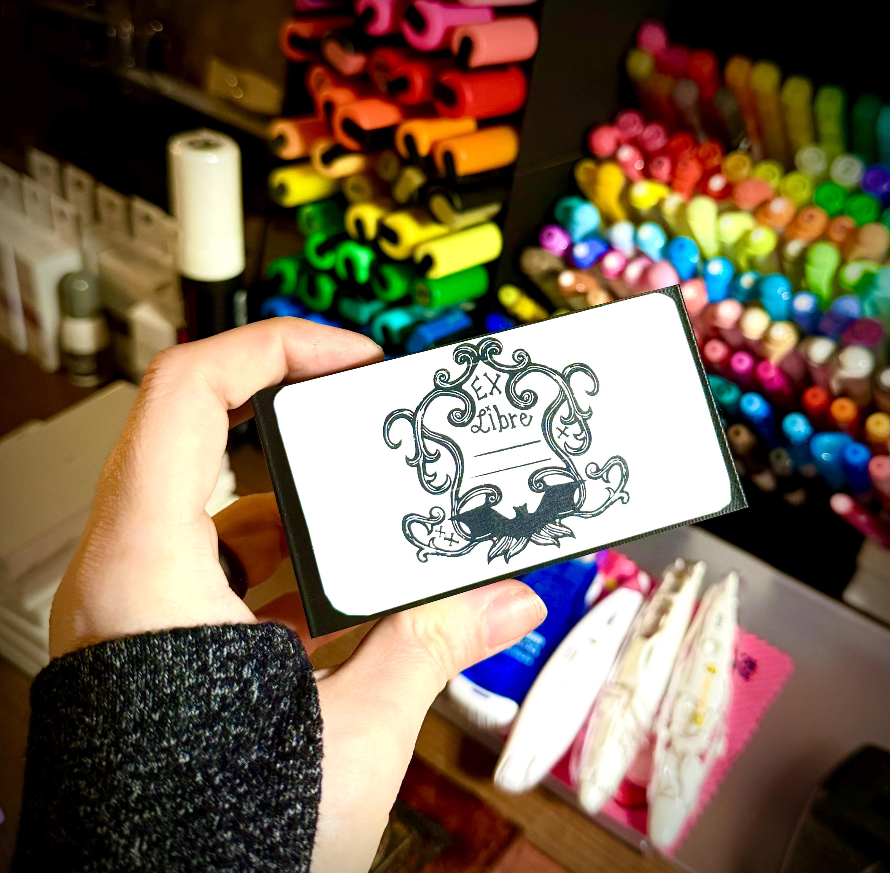 This ornate bat-framed crest features “Ex Libre” in a dramatic gothic style — giving antique library energy with a haunted twist.
