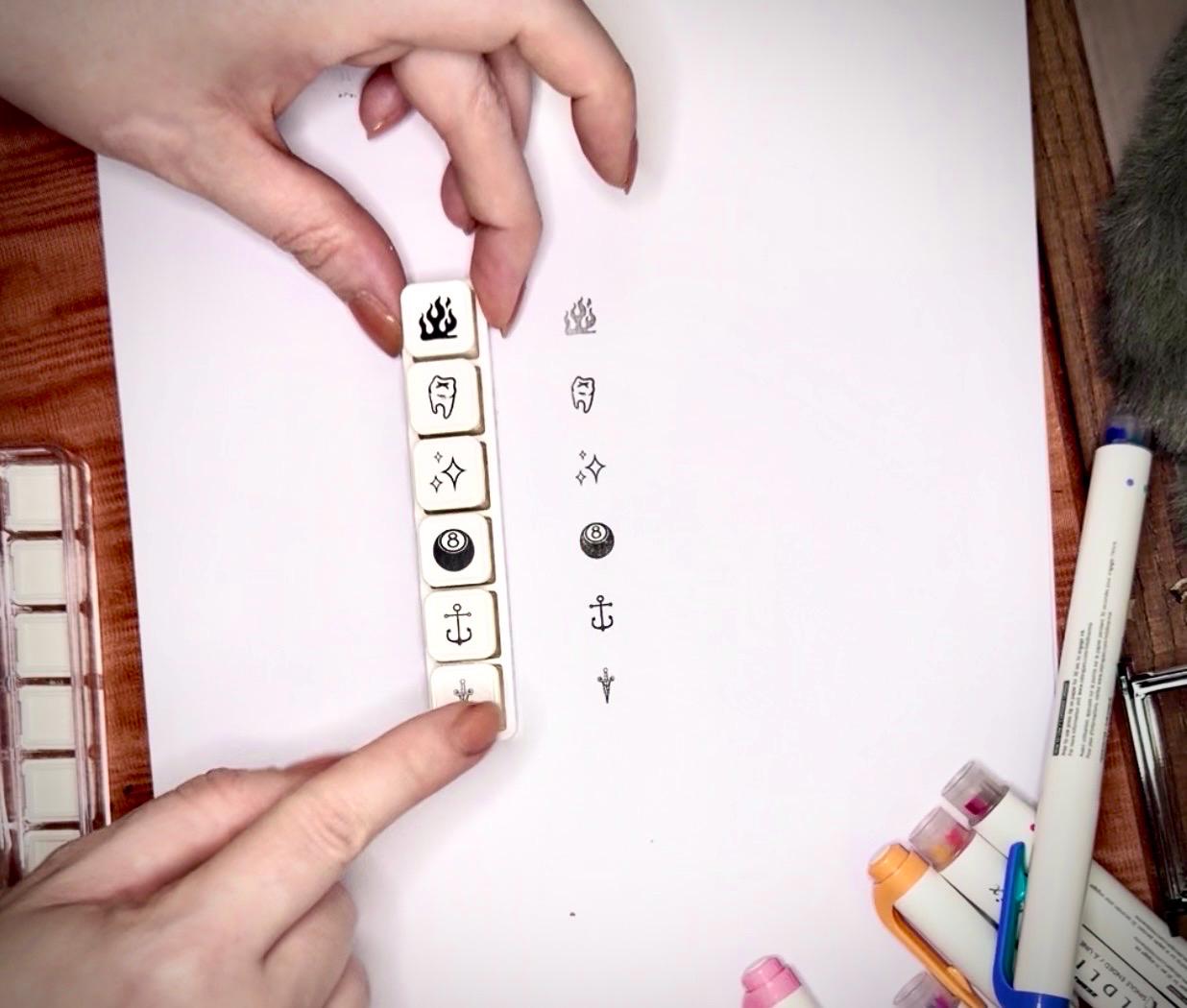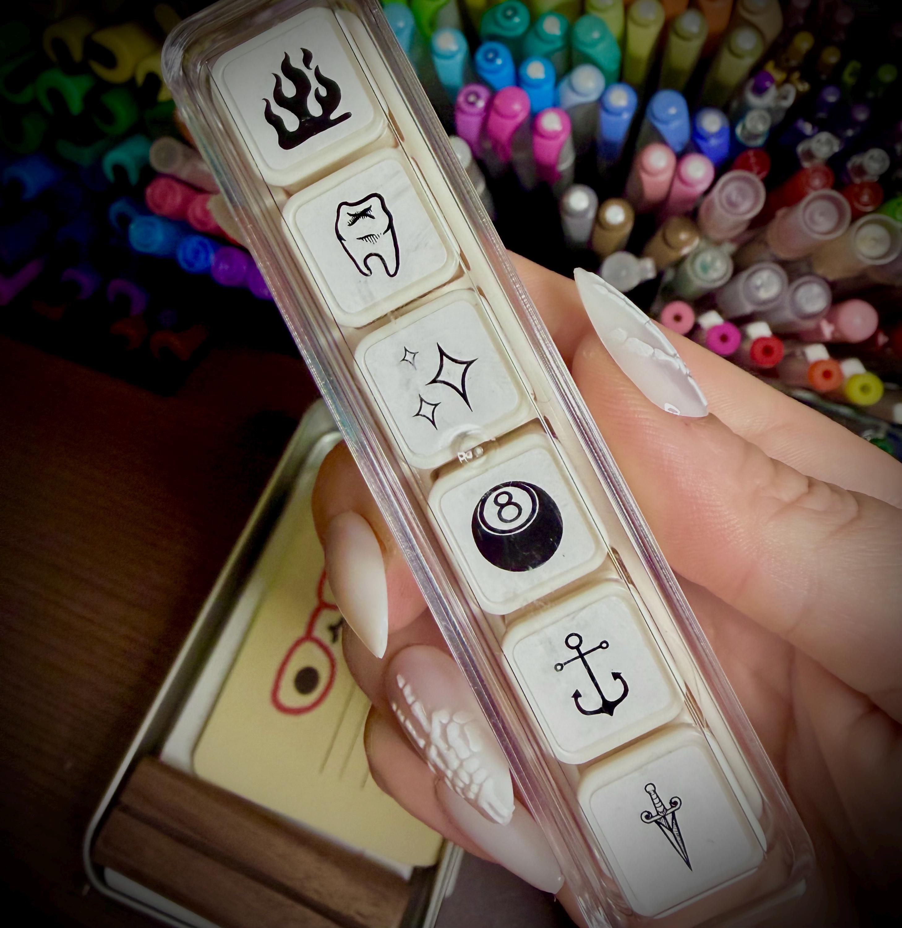 This 6-in-1 Tattoo Flash Stamp Set pulls from classic and Y2K-inspired iconography—featuring flames, dagger, anchor, tooth, sparkles, and an 8-ball.